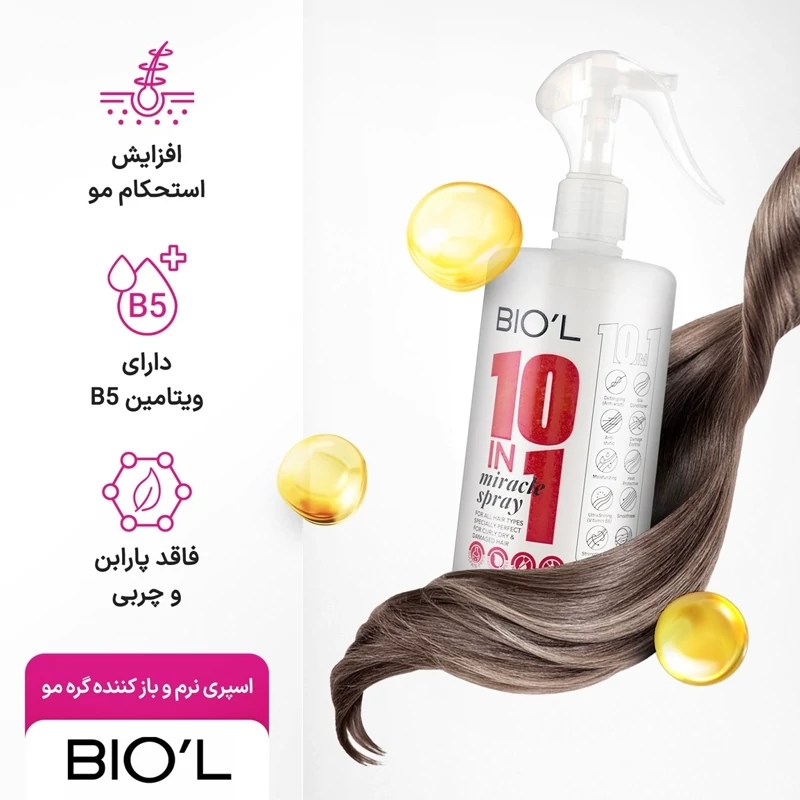 اسپری معجزه مو بیول مدل 10کاره نرم کننده و باز کننده گره مو بدون نیاز به آبکشی حجم 400 میلی لیتر