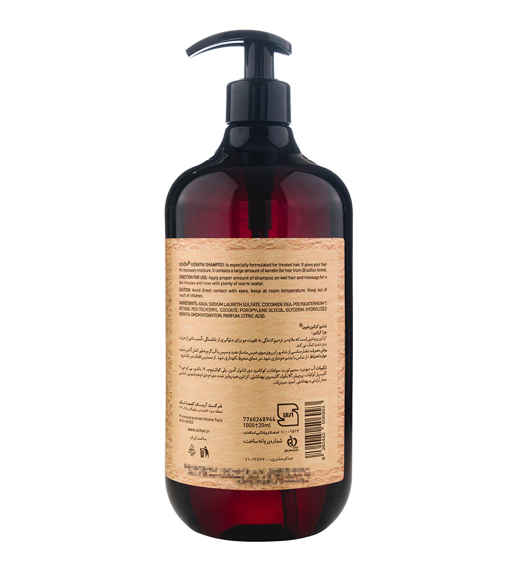 شامپو حاوی کراتین شون، دارای خواص آنتی اکسیدانی بسیار قوی وبوده که سبب ترمیم کننده موهای آسیب دیده میشود. این محصول، ضمن پاکسازی موها و پوست کف سر به رطوبت رسانی موها کمک کرده و در رفع و کاهش خشکی آنها موثر است. شامپو حاوی کراتین شون، فاقد پارابن بوده و برای استفاده روزانه مناسب است.