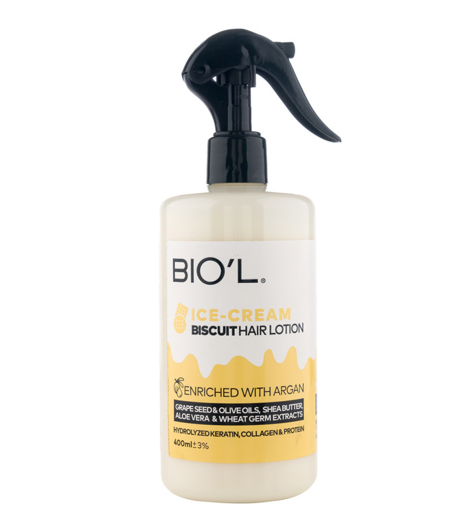 لوسیون مو بدون آبکشی بیول BIO'L مدل بستنی بیسکوئیتی ترکیبی از روغن های مفید از جمله روغن زیتون، هسته انگور و آرگان و همچنین عصاره آلوئه ورا و شی باتر تشکیل شده که مغذی و آبرسان پوست و مو بوده و این لوسیون مو را تبدیل به اکسیری برای مراقبت از موها بعد از استحمام کرده اند. بستنی مو بیول با بهره گیری از قدرت ویتامینه دو عصاره ذکر شده و عناصر معدنی پتاسیم، روی و مس،تقویت کننده و تغذیه کننده بی نظیری برای موهای شما خواهد بود.