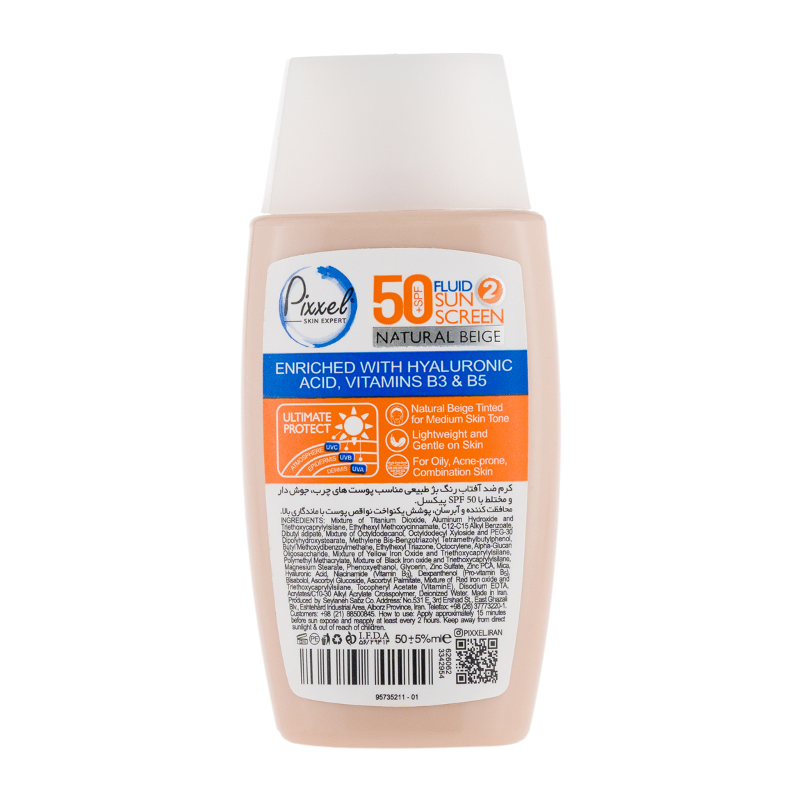 ضد آفتاب رنگی پیکسل بژ طبیعی Spf50 مناسب پوست چرب و مستعد جوش حجم 50 میلی لیتر